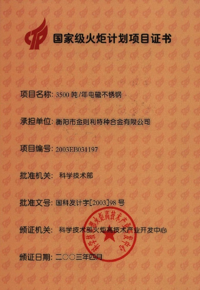 • 國家級火炬計劃項目證書